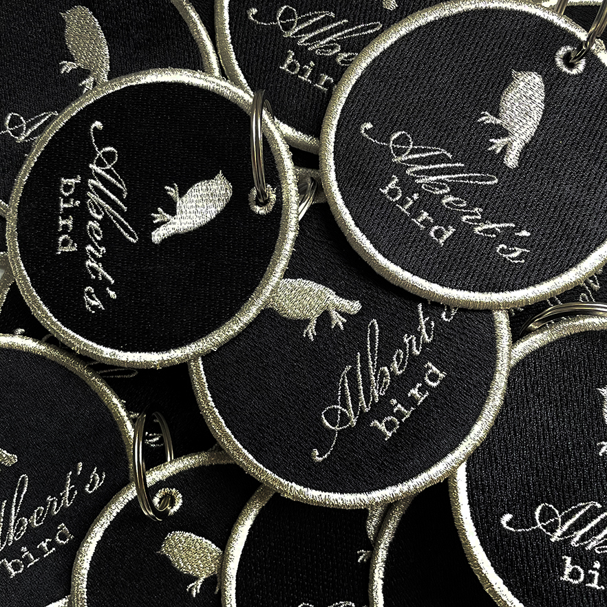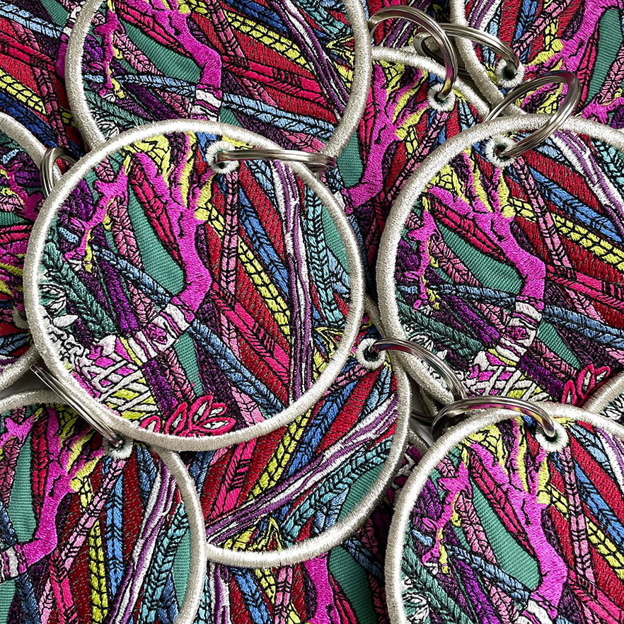 Beidseitig bestickte, runde Anhänger mit dem Muster der Seidenstoffe und dem Logo des Labels